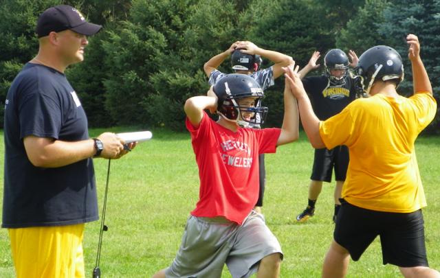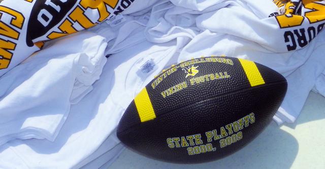 More than 120 young athletes joined the Vinton-Shellsburg High School football players during Football Camp last week. At the end of the camp, players received T-shirts. A special black and gold football on display on the table with the T-shirts reminded the players that the Vikings made the playofffs in 2000 and again in 2009. Coach Patrick Farley and his assistants are now leading the Vikings in the second day of football practice as the team seeks to return to the post-season for a second straight year.