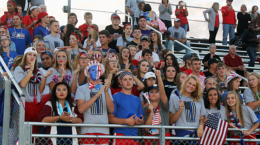 After the 3rd quarter, many current and former firefighters and other emergency personnel walked on the field to receive recognition. UHS students who filled the south section of the bleachers wore a variety of unique red, white and blue outfits to celebrate patriotism.