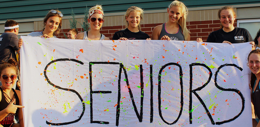 Union seniors hold the State VB Qualifier banner; they play their first game at State on Wednesday.