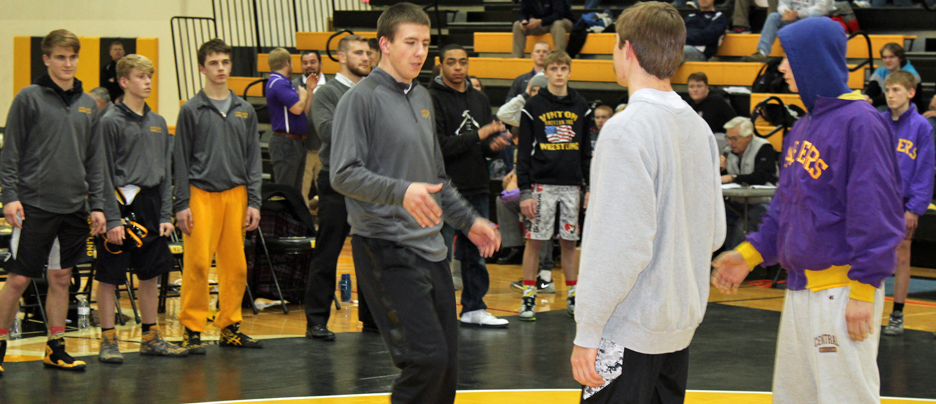 Kort Johnson shakes hands with his opponents before his two-victory night in Vinton.