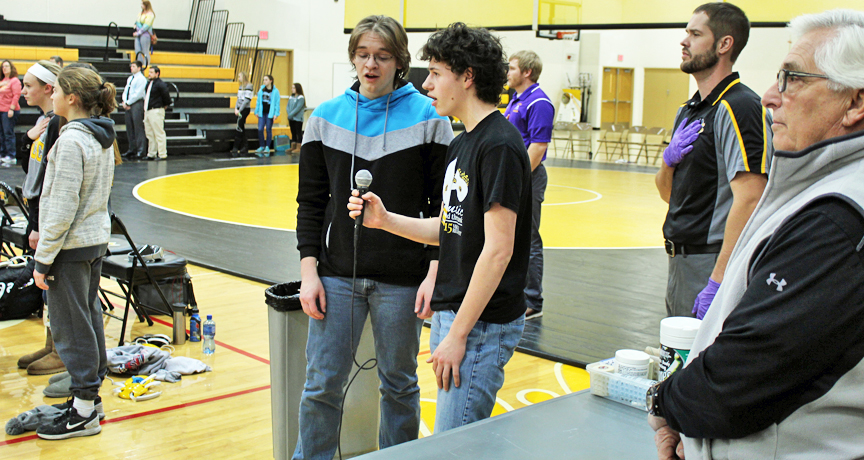 Owen Sloop and Casey Funk sing the National Anthem before the beginning of the VS wrestling meet on Thursday.