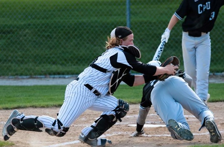 Will Edwards tags out a runner at the plate against CPU to help preserve a Viking victory. Photos courtesy of Tony Bopp, Visual Journey Photography.