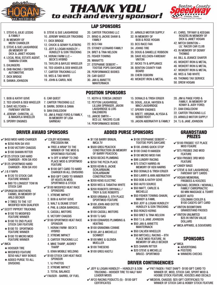 The IMCA Modified winner at Benton County Speedway's 23rdannual Hogan Memorial could take home a check for more than $5,000.