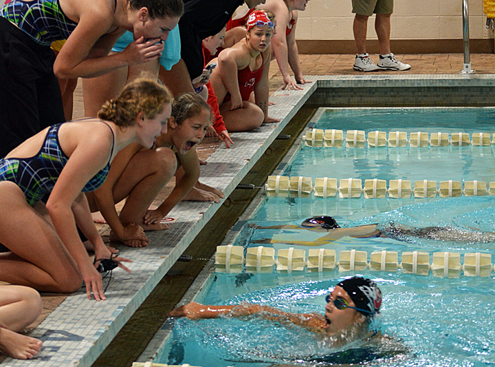 Amanda Cardenas finishes her Breaststroke turn as teammates Clarissa Carolan, Lizzie Moore, Natalie Tecklenburg, and Emily Levis cheer her on.