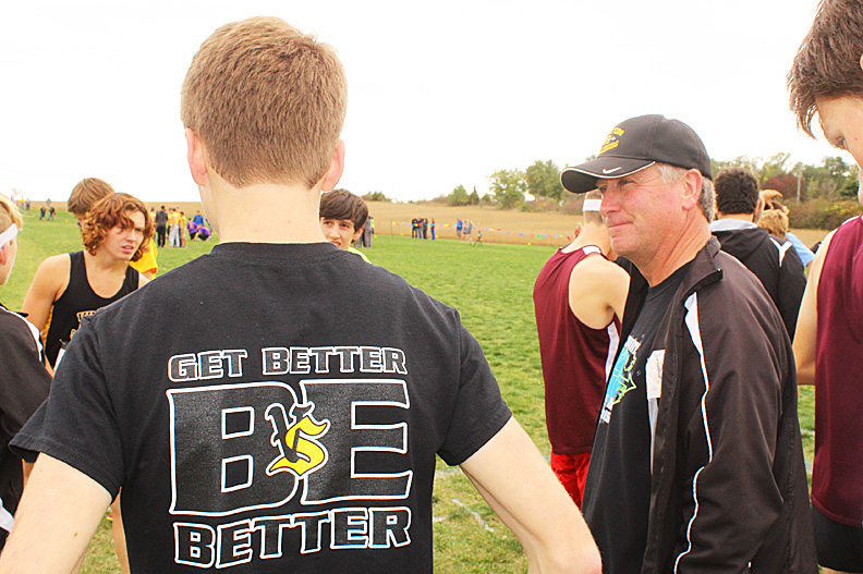 John Frazier speaks to members of the VS boys CC team before the home meet in September.