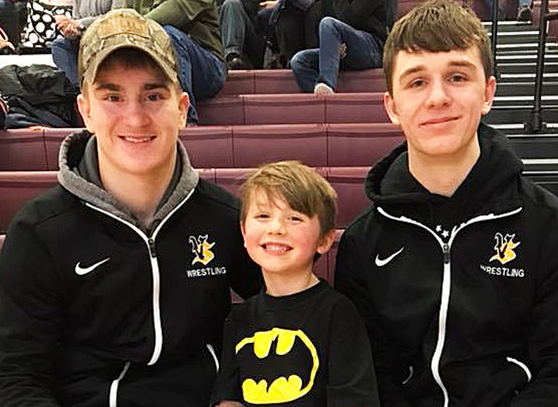 Kollyn , the son of VS wrestling cheerleading coach Rachelle Rammelsber, poses with VS wrestlers John Betterton and Luke Radeke, two of the Vikings heading to State.