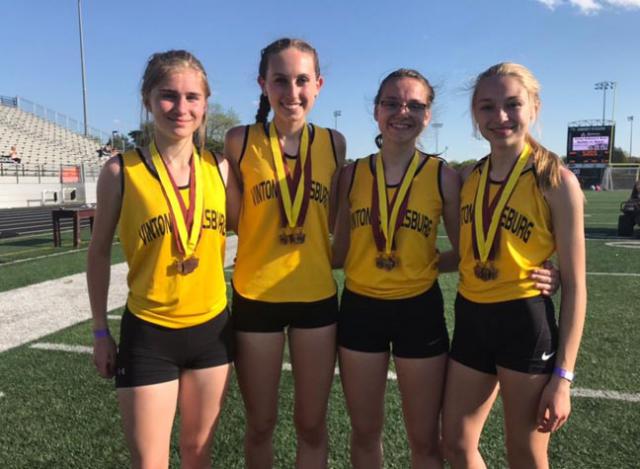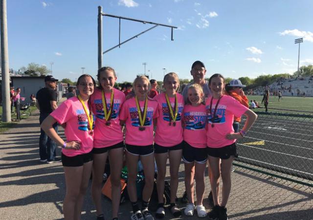 The seven 8th grade girls who competed in the Middle School State Meet last Saturday were Molly Haisman, Kali Burke, Baylee Wheeler, Gracie Drury, Kate Timmermann, Jade Coots, and Annabelle Newton. They did an outstanding job. Kali placed in the top 12 in both shot and disc. She was competing against 3A and 4A schools. The foursome of Coots, Newton, Timmermann, and Drury placed 6th in both 4 x 200 and the sprint med. They finished 4th in the 4 x 100. They set records in the 4 x 100 (0:54.69) and The sprint med. (2:03.91)