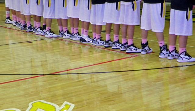 The Vinton-Shellsburg fans could tell there was something special going on Friday, when the Vikings hosted Solon. The boys wore pink socks – yes, pink. They even work pink and black warm-up jerseys. Scores of fans were also wearing pink of some sort. The girls basketball players were there, too – in pink, of course.