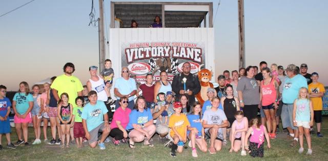 Jay Schmidt earned an extra $150 from Christie Door Company for his last-lap pass on the way to victory in the IMCA Sunoco Stock Cars presented by Albert Auto Service.