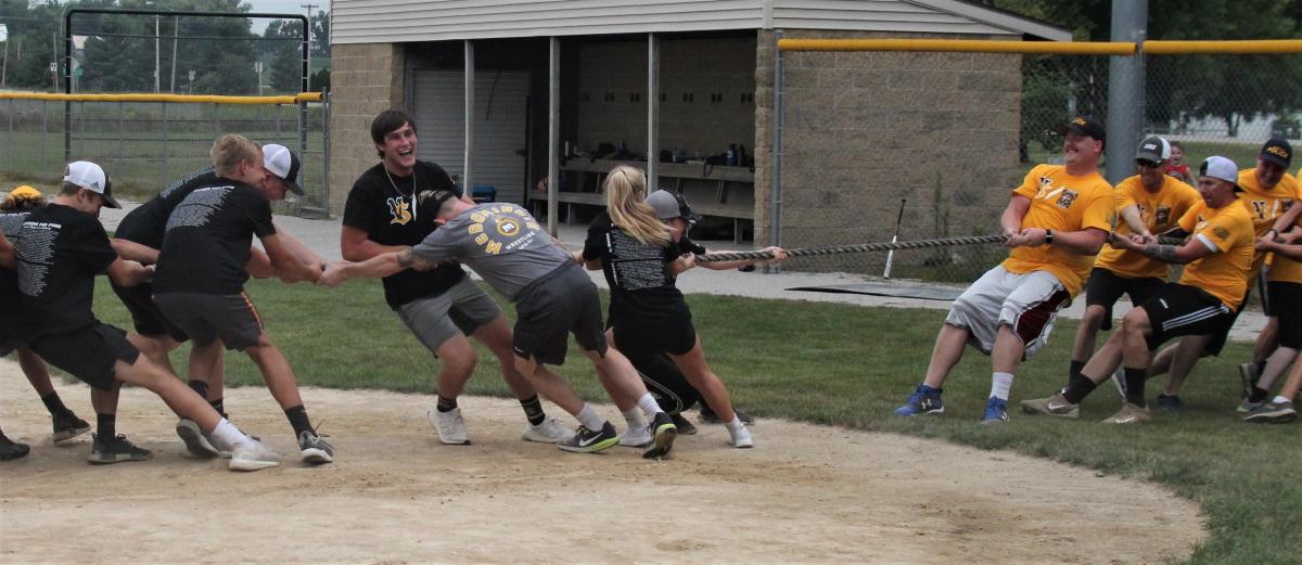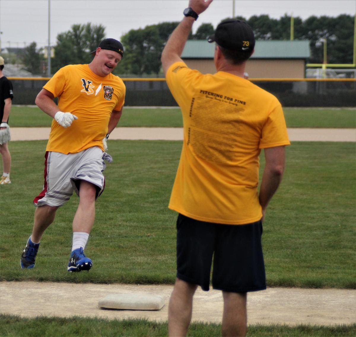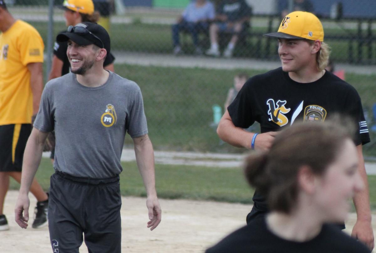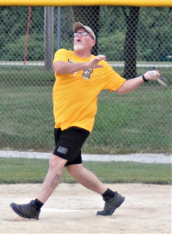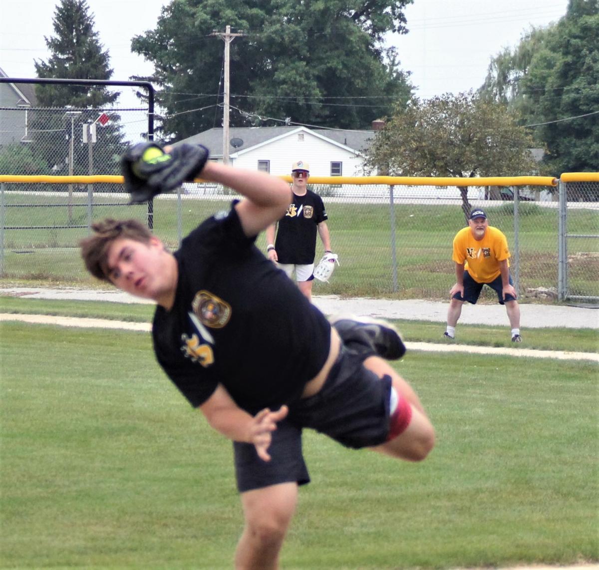 VINTON -- A big crowd filled the Vinton-Shellsburg baseball field grounds Saturday for the first "Pitches For Pins" fund-raiser for the VIking and Vikette wrestling programs. A team of local law enforcement faced off against members of the wrestling team -- along with a couple of "ringers" -- and while the wrestlers led most of the way, the cops came back to take a 16-14 victory; not that the outcome mattered that much.