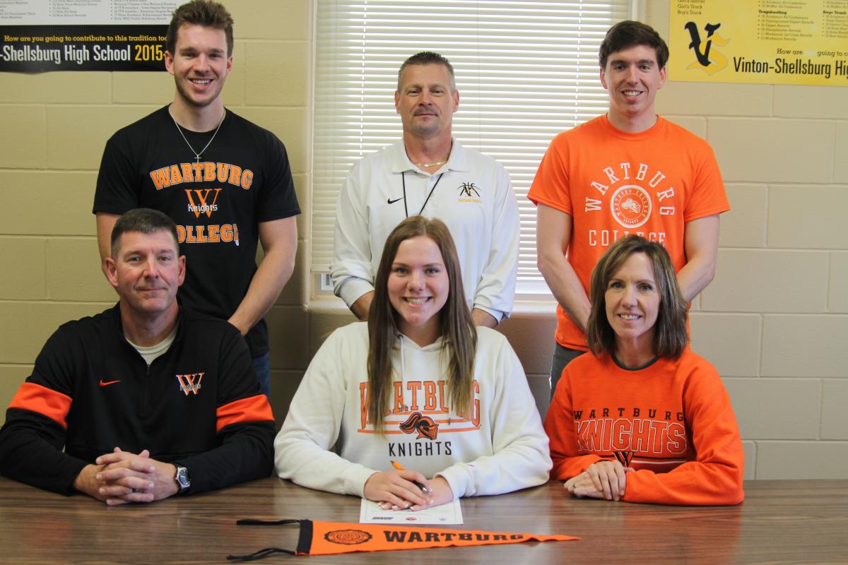 VINTON – Vinton-Shellsburg Vikette varsity track and field shot putter Abby Bartz signed with the Wartburg Knights women's track and field team joined by Vinton-Shellsburg throws coach Jim Womochil, her parents Brad and Brenda Bartz and her brothers Tyler and Justin Bartz.