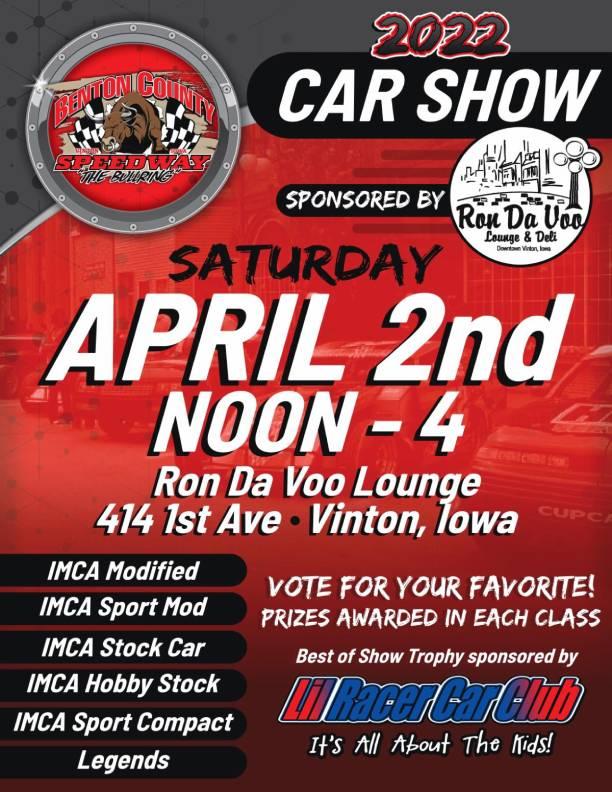An old tradition is returning for race fans of The Bullring.What used to be an annual event to kick off the season at Benton County Speedway, the annual car show on the streets of downtown Vinton is making its return.Sponsored and hosted by Ron Da Voo Lounge and Deli, competitors at The Bullring are invited to put their cars on display from noon-4 p.m. on 1st Ave Saturday, April 2.Prizes will be awarded in each of the six weekly divisions scheduled to compete this season - IMCA-sanctioned Modifieds, Stock Cars, Hobby Stocks, Northern SportMods and Sport Compacts, plus Legends. A Best of Show award is sponsored by Lil Racer Car Club.The annual Frostbuster for IMCA Modifieds, Stock Cars, Hobby Stocks and SportMods will open the 2022 season on the fast quarter-mile Wednesday, April 6.Opening night for weekly points racing is slated for Sunday, April 24.For the latest speedway news, visit the online home of The Bullring at www.bcsbullring.com or check out the track's Facebook page @BCSBullRing.