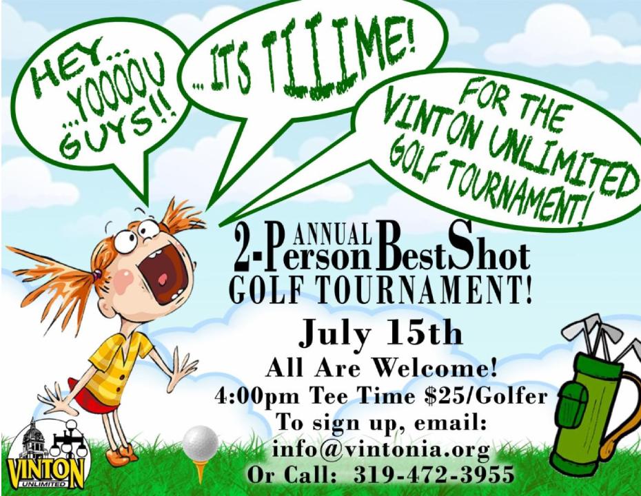 The Vinton Unlimited Golf Tournament will be held on Friday, July 15th, 2022 at the Vinton Country Club. All are welcome!