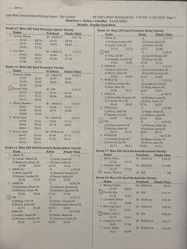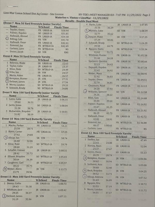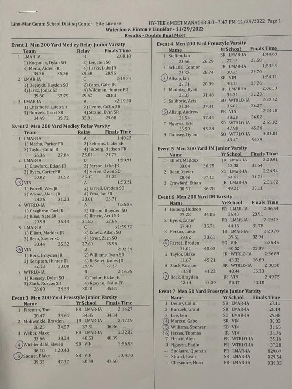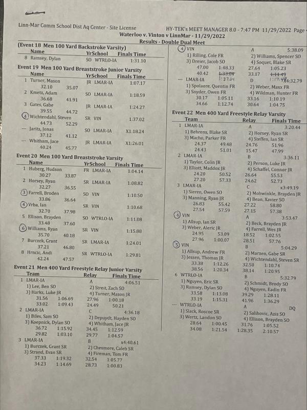 The VS/CPU boys swim split on Tuesday night at Linn Mar vs LM and Waterloo. Linn Mar is going to be one of the top few teams in the state. They are absolutely loaded.