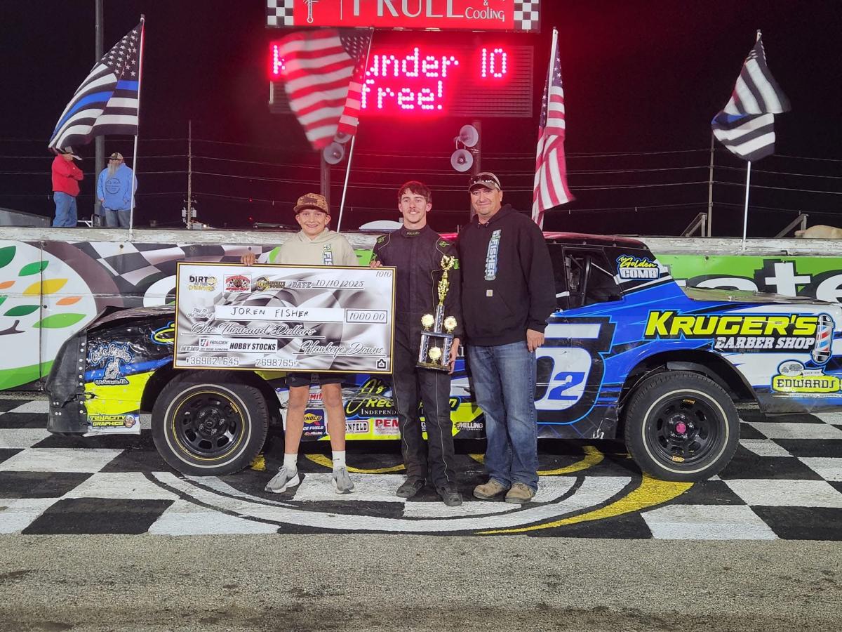Joren Fisher found victory lane in the Hobby Stocks. Braxton Franks was the early leader as Justin Wacha and McKenna Koch battled for second. Fisher began to work the high line as Justin Stander and Jake Keiser challenged each other for fourth. Fisher reeled in Franks as Jerry Gifford moved into the top four. Fisher and Franks were side-by-side as laps wound down. Fisher crossed the line first, Franks, Wacha and Gifford followed.