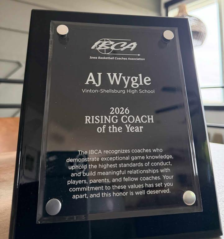The Iowa Basketball Coaches Association (IBCA) recognized Vinton-Shellsburg's Coach, AJ Wygle as the Rising Coach of the Year for 2026.