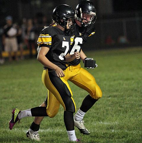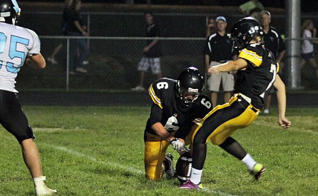 The Vikings scored on a 52-yard pass from Lincoln Riffey to Kelyn Rickels early in the first quarter en route to a 35-21 win in their home opener against South Tama. The holder for the extra point kick, Darren Charlier -- who missed the first game because of a concussion he suffered in the Viking Blowout scrimmage -- took the snap and ran in for the two-point conversion on the fake, giving the Vikings an early 8-0 lead.