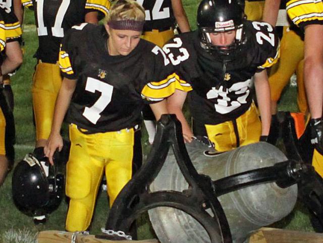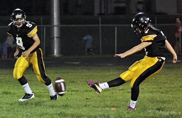 Vinton-Shellsburg school history was made on the extra point attempt, when Kelly Wagner kicked the ball through the uprights. It was the first point scored by a female for the Vikings. She would kick two more extra points during the game.