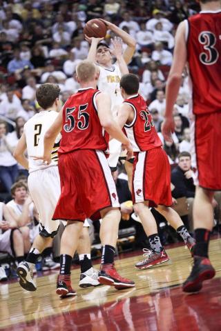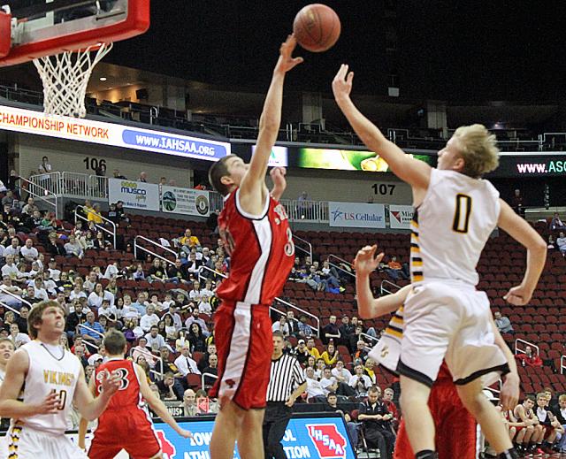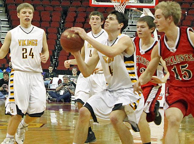 Led by 6-foot, six-inch junior Trey Lansman, the Harlan Cyclones blocked seven Vinton-Shellsburg shots and out-rebounded the Vikings, 35-28. Lansman, who had blocked 80 shots in the first 24 games, added six more to his total as the Cyclones advanced to play MOC-Floyd Valley. He and other Cyclone defenders challenged the Vikings on nearly every shot, forcing more misses than normal. The Vikings hit just 16 of 49 shots – under 33 percent.